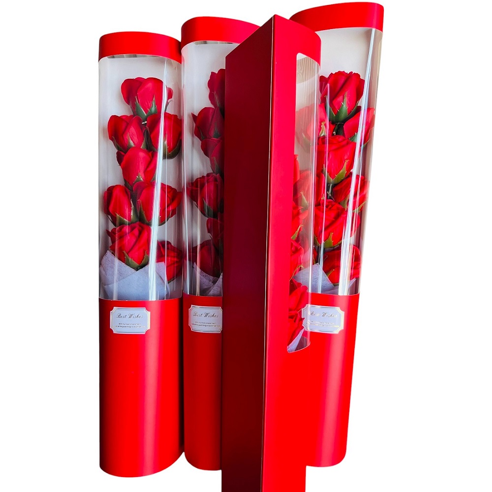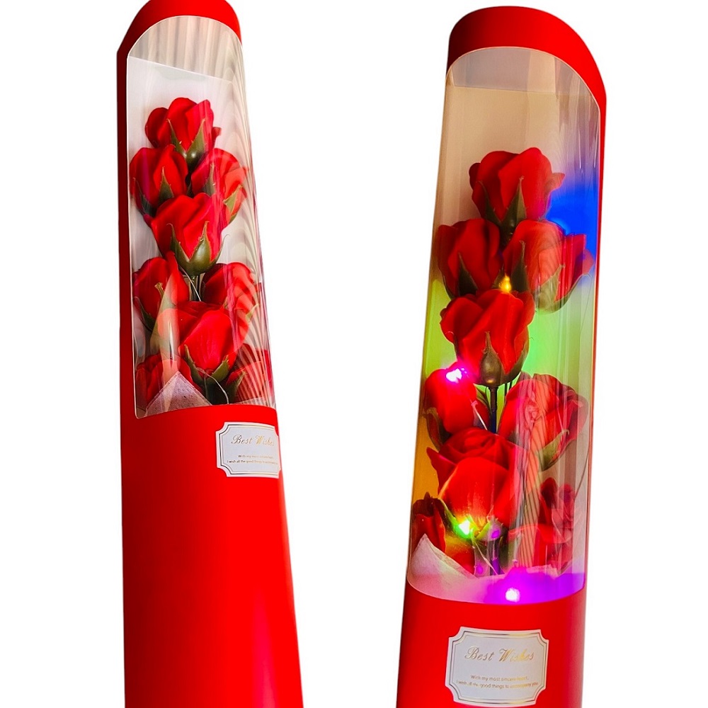 Hermosas rosas con pétalos de jabón perfumadas perfectas para regalar a esa personita importante en su día. El ramo de 9 rosas viene con luces y cajita de cartón, su aroma a rosas lo vuelve único en el mercado.