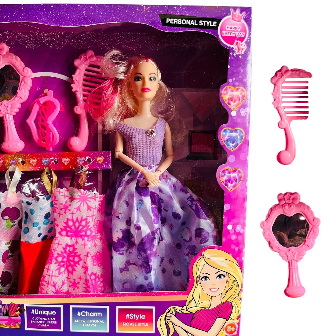 Cuenta con diferentes accesorios lo que lo vuelven único en el mercado, incluye un peina, un espejo, un gancho, 3 cambios de vestidos adicional y dos muñecas ya vestidas