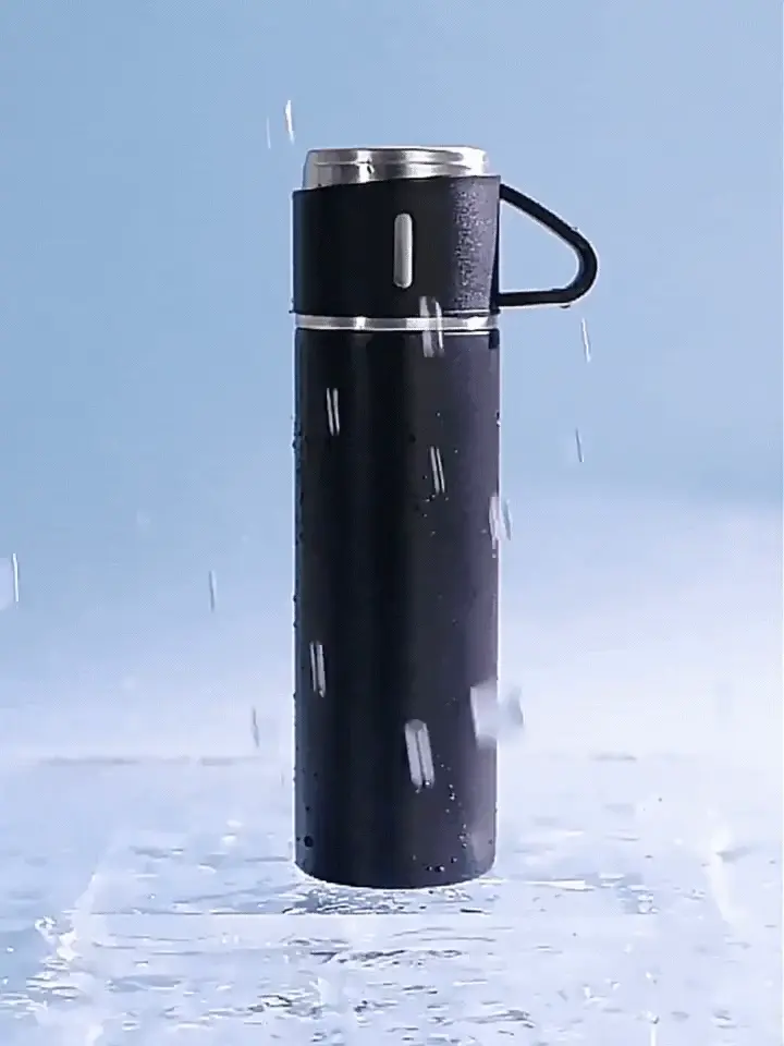 Me encanta este termo de 500 ml con 2 tazas de acero inoxidable porque mantiene mis bebidas calientes por horas y es muy resistente para llevar a cualquier lugar.