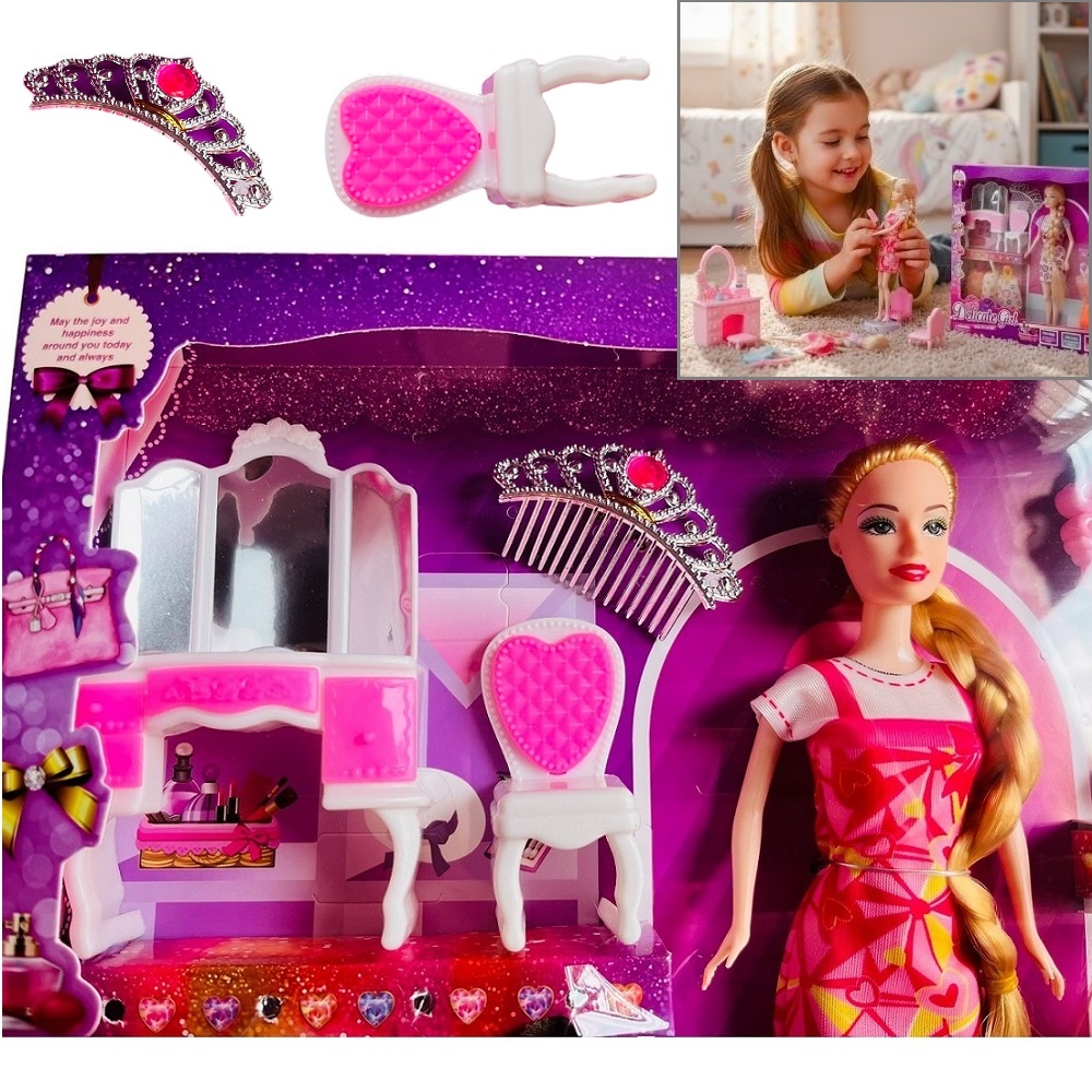 Cuenta con diferentes accesorios lo que lo vuelven único en el mercado, incluye un tocador, un peine, una silla, un espejo, una corona, 5 cambios de vestidos y una muñeca y6a vestida.
